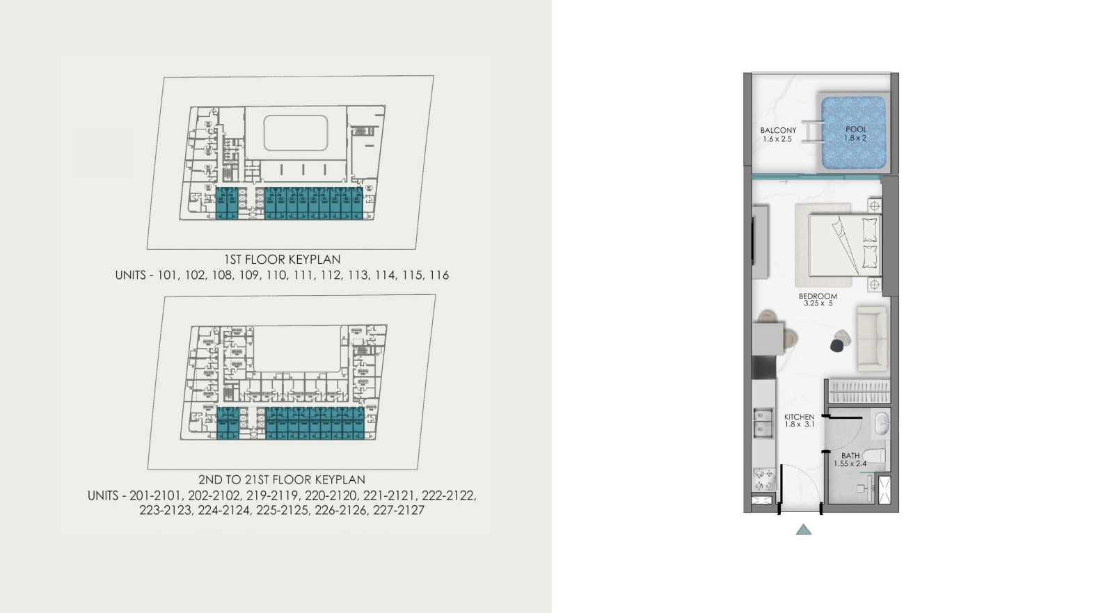 - Piscina privada en la terraza: 1,6 x 2,5 m (exclusiva para cada unidad)