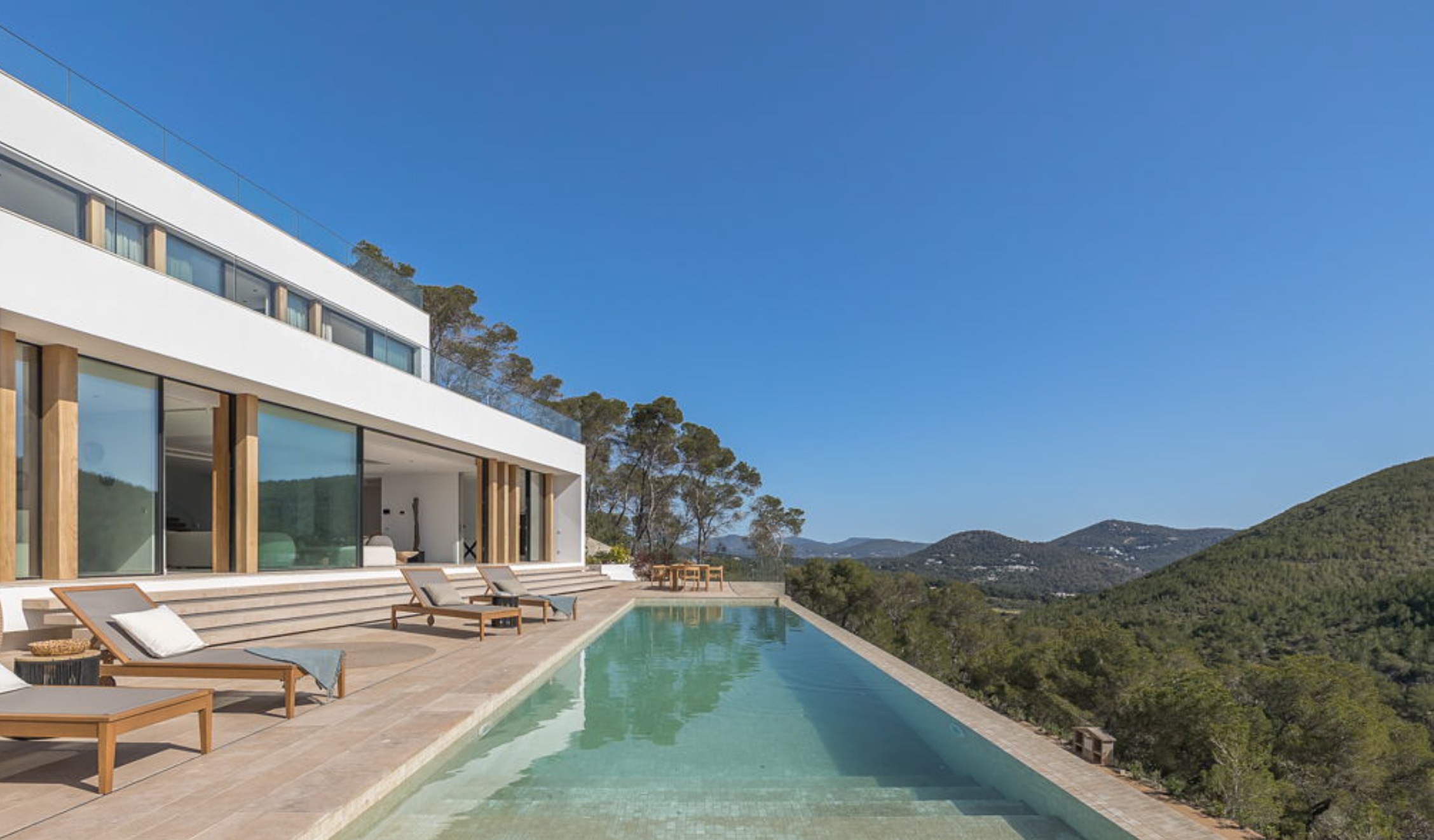 La villa dispone de seis dormitorios, todos con baño en suite y vistas al mar o a la montaña. Al entrar en la vivienda, destaca inmediatamente el amplio salón, inundado de luz natural. Desde este espacio ya se pueden disfrutar hermosas vistas al mar.